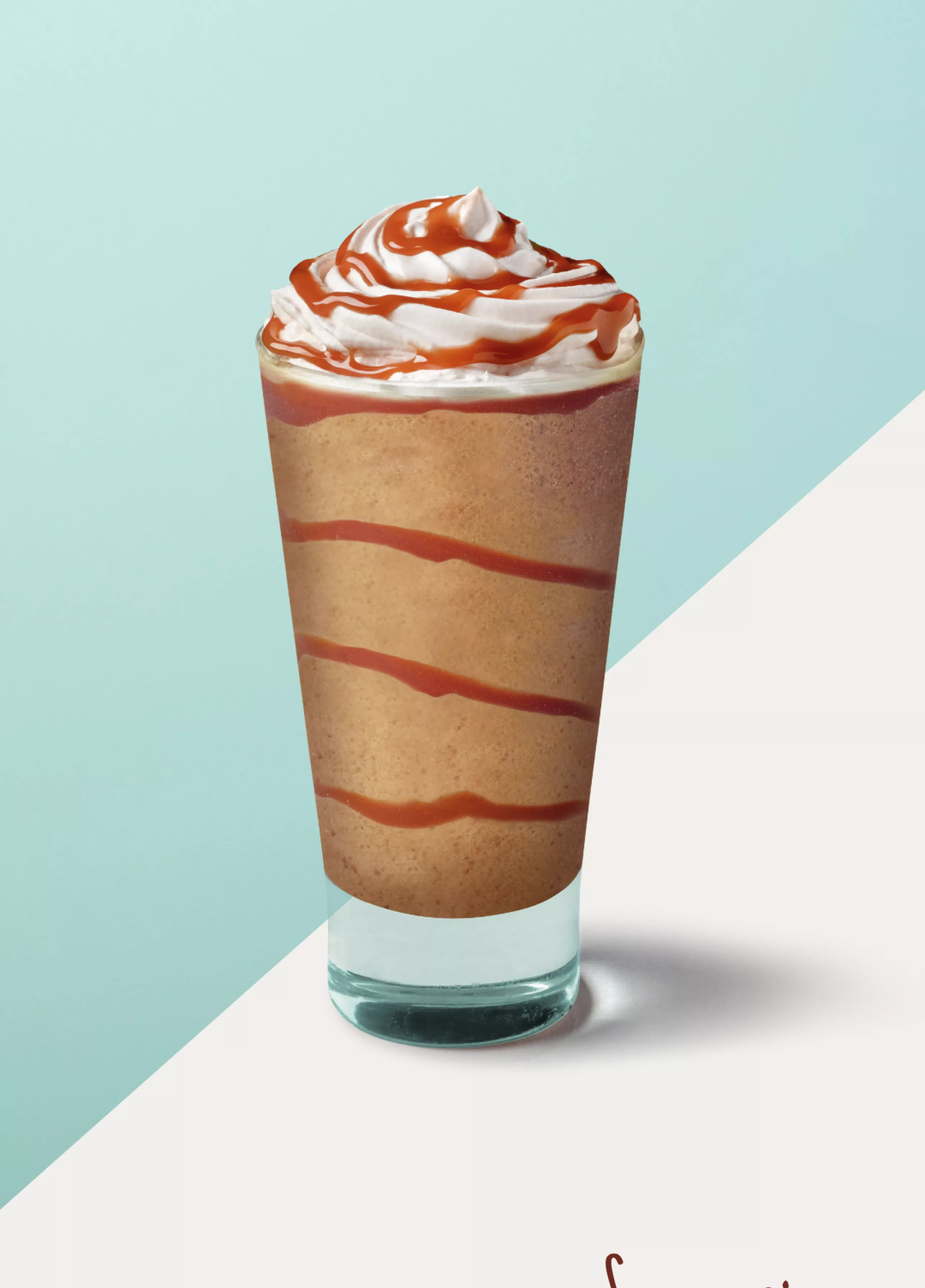 نكهة كاراميل ممزوجة مع قهوة وحليب ومخفوقة مع ثلج يعلوها كريمة مخفوقة و صلصة كاراميل إضافية