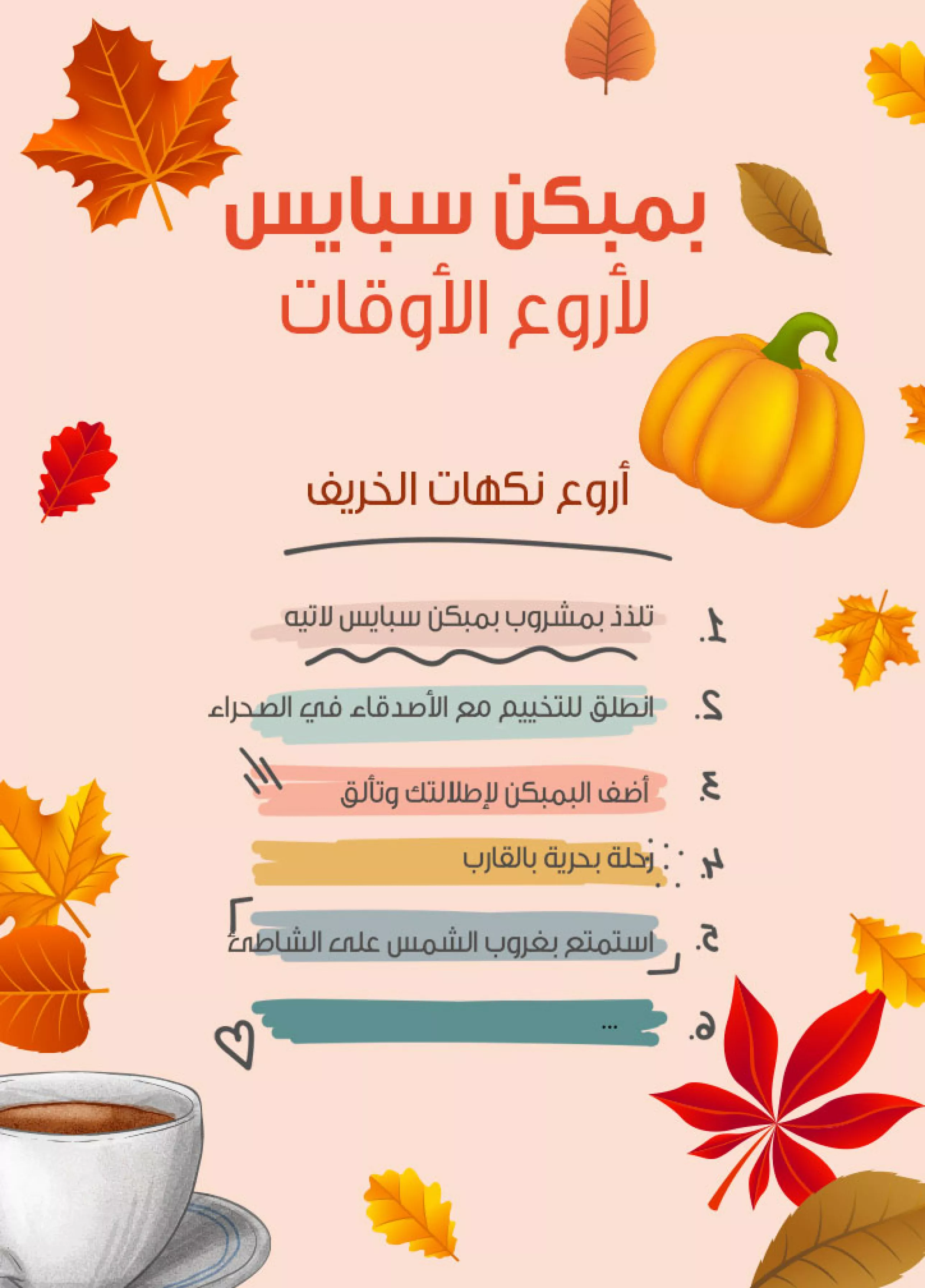 احتفل بأجواء الخريف الحلوة مع نكهات البمبكن اللذيذة. مشروب بمبكن سبايس لاتيه المميز المحضر من مزيج لا يقاوم من جوزة الطيب والقرنفل مع خلطة الاسبرسو الخاصة بنا، مع كريمة مخفوقة وسكر بالقرفة - نكهة عطرية ستحبها حتماً.