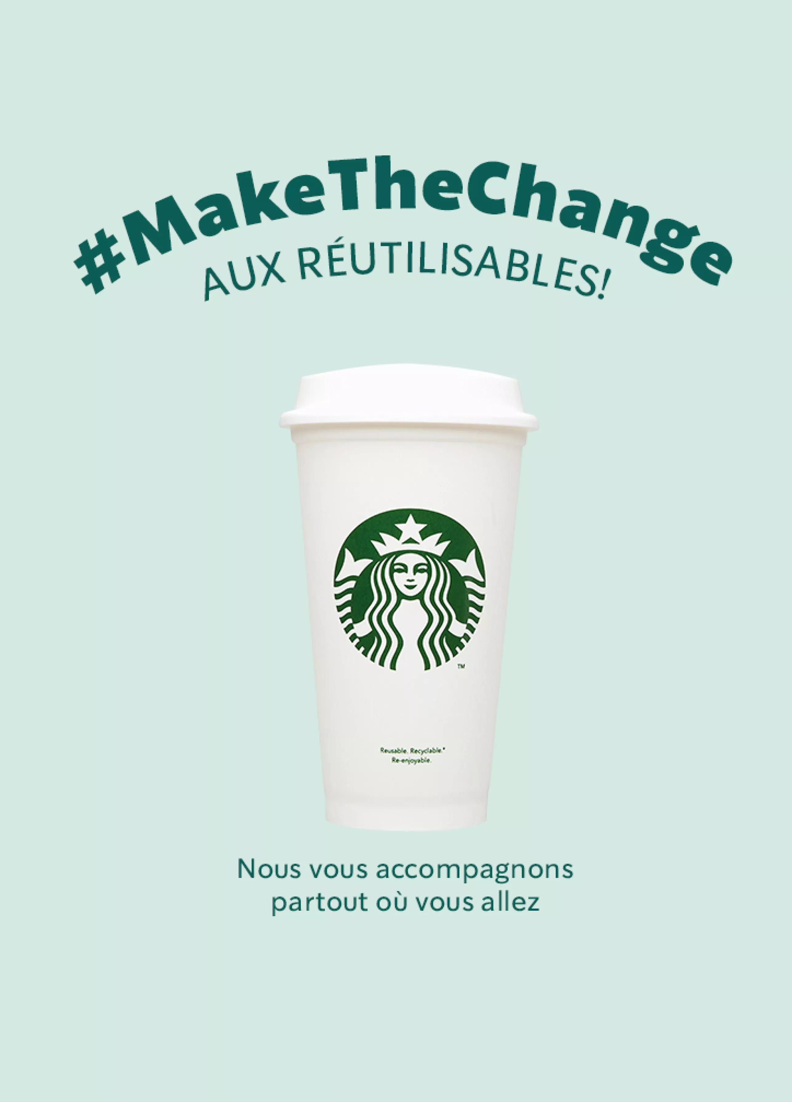 C'est sûr, sans contact et en déplacement ! Apportez votre tasse réutilisable et propre pour savourer votre boisson Starbucks préférée et aidez-nous à #MakeTheChange.